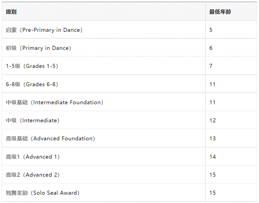 (从中级基础-Intermediate Foundation到独舞奖励-Solo Seal Award)为学生深入学习芭蕾舞建立起框架,提升其技巧、音乐和表演技能至更高的等级。